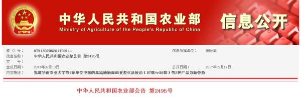 信息來源:中華人民共和國農業部公告 第2495號
