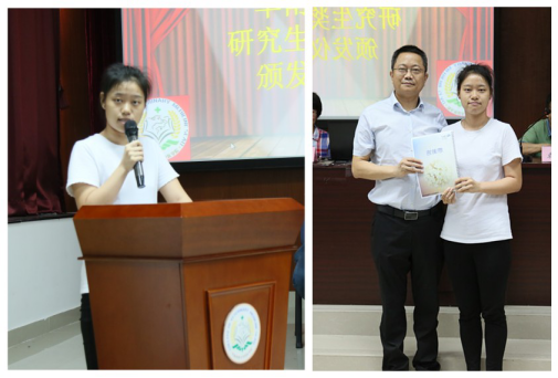獲獎(jiǎng)代表朱夢(mèng)嬌同學(xué)發(fā)言,向華南生物表示敬意及感謝,承諾以后更加努力學(xué)習(xí),時(shí)刻鞭策自己,以取得更加優(yōu)異的成績(jī)并投桃報(bào)李。