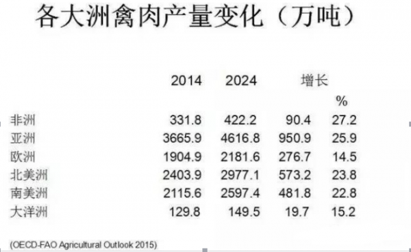 此外,據FAO(聯合國糧食及農業組織)統計,全世界雞肉產量保持平穩增長,雞肉生產總量近一億噸。但各大洲區域發展不太平衡。2014-2040年期間,雖然非洲地區雞肉生產基數低,但增長最快,增速為27%。因此在非洲,肉雞生產潛力巨大。