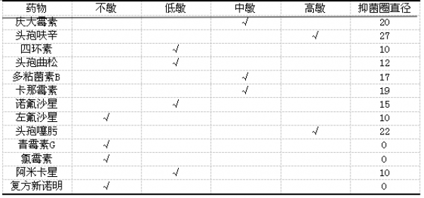 3.3 藥敏試驗(yàn) 選擇14 種臨床常見抗菌藥物藥敏片, 在LB瓊脂平板上采用藥敏紙片擴(kuò)散法操作,37 ℃培養(yǎng)24h 觀察結(jié)果。判定標(biāo)準(zhǔn)為:藥物抑菌圈直徑>20 mm 為高敏,15 ~ 20 mm 為中敏,10 ~15 mm 為低敏,<10 mm 為不敏感。