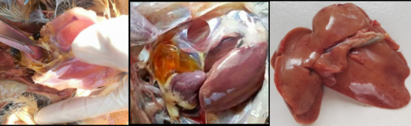 觀察雞群狀況,根據(jù)發(fā)病日齡、臨床癥狀、流行病學(xué)和死亡規(guī)律;解剖察看病理變化,若有上述特征性病變則可初步診斷;進一步診斷還需要采集病料(主要肝、腎、肺臟等病變組織),實驗室做核酸檢測。