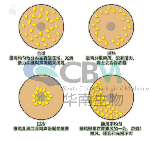 在實(shí)際飼養(yǎng)過(guò)程中。要根據(jù)情況看雞施溫。判定溫度是否適宜還要取決于雞群狀態(tài)。在正確的溫度下雞群散開,雛雞一般20—30只為一個(gè)群體,且不同群體間的雛雞相互運(yùn)動(dòng),叫聲清脆。溫度過(guò)高,雛雞沒(méi)有叫聲,張口喘氣,頭和翅膀下垂,遠(yuǎn)離熱源。溫度過(guò)低,雛雞在靠近熱源處扎堆,發(fā)生悲鳴的叫聲。賊風(fēng)、光照不均、外界噪音也會(huì)引起扎堆情況,要認(rèn)真觀察,加以區(qū)分。