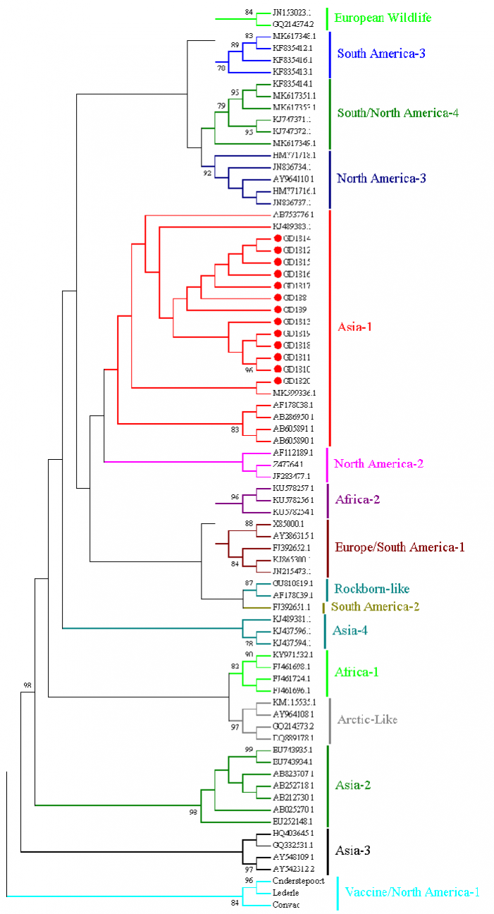 當下國內(nèi)寵物疫苗市場由進口產(chǎn)品所主導,但是合法注冊的進口產(chǎn)品并不能滿足國內(nèi)需求。大多數(shù)犬用CDV進口疫苗所包含的都是America-1型毒株,而國內(nèi)主要流行的是Asia-1型毒株。從進化譜系分析上來看疫苗株America-1所在的分支與流行的Asia-1型毒株距離較遠,基因差異可能導致中和表位的顯著變化,從而可能導致疫苗免疫失敗。此外國外有研究報道CDV的South America-3型毒株仍可使接種過包含America-1型毒株疫苗的犬發(fā)病。由此可見符合國情的疫苗是才是CD防控的需求所在。