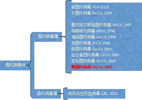 最早在2002年,德國科學(xué)家Hattermann 發(fā)現(xiàn)勃蘭登堡某養(yǎng)鴨場的法國番鴨表現(xiàn)出羽毛凌亂、生長遲緩、體重減輕等癥狀,認(rèn)為這與其他禽類感染圓環(huán)病毒后的臨床特點很相似,于是對樣品進行負(fù)染電鏡(EM)檢測發(fā)現(xiàn),法氏囊中存在無囊膜的球狀病毒,直徑大約為 15~16nm。最終根據(jù)圓環(huán)病毒rep基因的鑒定,發(fā)現(xiàn)與其他圓環(huán)病毒同源性僅39%~60%,與鵝圓環(huán)病毒同源性最高,但也僅為82%。推斷新發(fā)現(xiàn)的可能為新的圓環(huán)病毒,鴨圓環(huán)病毒DuCV。